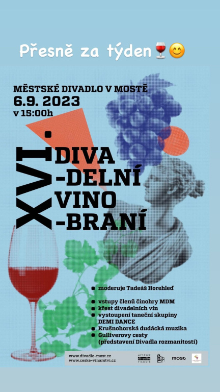 Svá vína si letos pokřtí Zita a Jan Benešovi za výkony v inscenaci Jakeovy ženy režiséra Martina Vokouna. Na programu budou vystoupení z řad členů činohry MDM, taneční vystoupení skupiny Demi Dance, Krušnohorské dudácké muziky a v neposlední řadě představení Divadla rozmanitostí Gulliverovy cesty. V rámci vinobraní proběhne také akce na vstupenky do divadla a chybět nebude prodej burčáku, či lahodných sýrů ze Sýrárny Kahan Most. Celým odpolednem provede herec Tadeáš Horehleď.