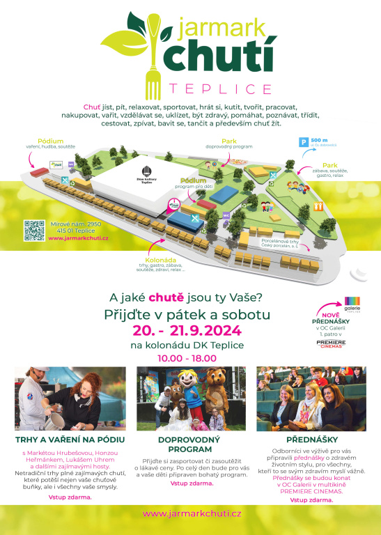 Pro návštěvníky Jarmarku chutí připravili také vzdělávací bannery, které informují o důležitosti vitamínů a minerálních látek v těle. Budou umístěné přehledně na sloupech kolonády. V multikině Premiere Cinemas v OC Galerii Teplice budou v pátek 20.9. od 10.00 - 13.30 hod. probíhat přednášky zaměřené nejen na zdraví, zdravou stravu, ale i na další palčivá témata dnešní doby. Stejně jako v minulých ročnících vystoupí přední odborníci ve výživě. Vstup na Jarmark chutí je ZDARMA.