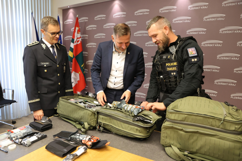 „Myšlenka dovybavit policejní jednotky, především ty prvosledové, zdravotnickým materiálem, vznikla na jednání Bezpečností rady Plzeňského kraje v reakci na útok na filozofické fakultě v Praze. Tam se ukázalo, jak je zásadní poskytnutí první pomoci policisty, kteří byli na místě tragédie,“ říká hejtman Plzeňského kraje Rudolf Špoták, který dnes za Plzeňský kraj předal zakoupený materiál pro PČR řediteli Krajského ředitelství policie Plzeňského kraje Petru Macháčkovi.
