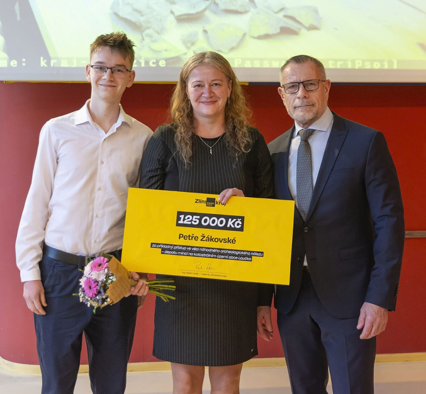27. února 2025, 09.37 | Zlínský kraj – Poctivou nálezkyni 768 stříbrných mincí mimořádně odměnil Zlínský kraj částkou 125 tisíc korun. Dar za odevzdání náhodného archeologického nálezu z katastru obce Loučka u Vsetína z roku 2022 si Petra Žákovská převzala spolu se svým synem Michalem, který byl u nálezu také přítomen, na krajském úřadě z rukou radního pro oblast kultury Ivana Lásky.