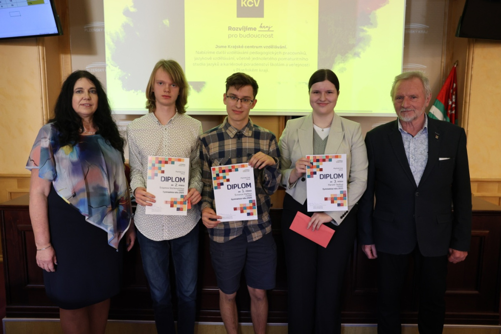 23. března 2025, 08.05 | Plzeň - Nejlepší studenti gymnázií z Plzeňského kraje poměřili síly ve vědomostní soutěži Gymnazista roku. Vítězem letošního 9. ročníku soutěže je Šimon Mařík z Církevního gymnázia Plzeň, který se ve finálovém kvízu utkal se Štěpánem Stichenwirthem z Gymnázia Jar. Vrchlického v Klatovech a Marianou Talafovou z Církevního gymnázia Plzeň.