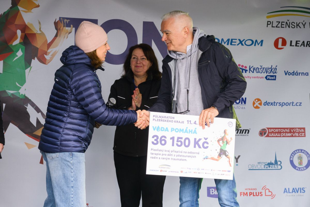 Součástí akce bylo i předání šeku z rukou hejtmana Plzeňského kraje, který ve spolupráci s Diakonií Západ a projektem Voda pomáhá věnoval celkem 36 150 Kč na odborné a dlouhodobé terapie pro děti z pěstounských rodin, které prošly náročnými životními situacemi. „Půlmaraton Plzeňského kraje patří mezi akce, které spojují široké spektrum účastníků – od zkušených běžců po rodiny s dětmi. Těší mě, že zájem o závod dlouhodobě roste a že se do něj zapojují lidé napříč generacemi. Akce má navíc charitativní rozměr. Pravidelně zde finančně pomáháme lidem v obtížné situaci,“ uvedl hejtman Plzeňského kraje Kamal Farhan.