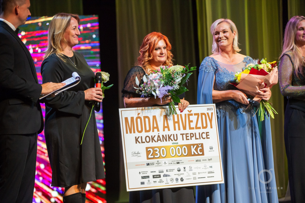 Na jevišti mosteckého divadla se vystřídaly krásné modelky, sponzoři i zpěváci, dobrou náladu zpestřili moderátoři David Gránský a Karel Kašák. A to nejdůležitější - představitelky teplického Klokánku, Dětského domova Vysoká Pec a Nadace Veroniky Kašákové si odnesly šeky v celkové hodnotě neuvěřitelných 710 000 korun. Použijí je na aktivity svých svěřenců, které by si jinak z běžných rozpočtů nemohly dovolit. Jak říká autorka myšlenky a pořadatelka Petra Vyoralová: Pomáhat má smysl!