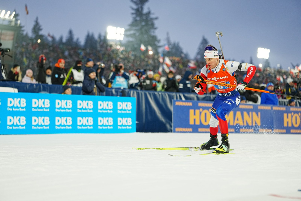 Finišmen Krčmář (na snímku) postupně vylepšoval umístění domácí sestavy. Jislová předávala devátá, Voborníková pátá a Hornig tuto pozici udržel. Krčmář ve finiši k radosti vyprodané Vysočina Areny porazil Američana Maximea Germaina. Celkem Češi dobíjeli sedmkrát. Pro Itálii získali zlato na poslední zastávce Světového poháru před olympijskými hrami Dorothea Wiererová, Lisa Vittozziová, Lukas Hofer a Tommaso Giacomel. Náhradních nábojů potřebovali deset.