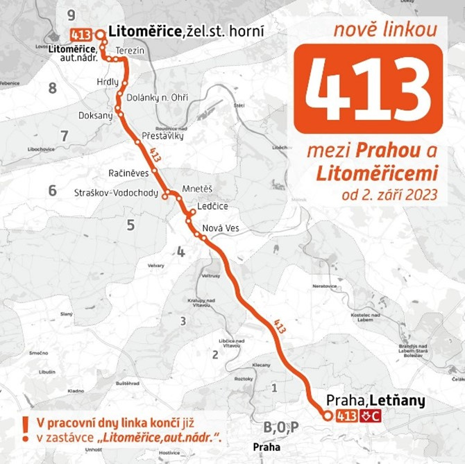 24. srpna 2023, 13.49 | Ústecký a Středočeský kraj - Díky dohodě obou krajů bude od 2. září zavedena nová autobusová linka 413 mezi Prahou a Litoměřicemi, která bude odjíždět od stanice metra C „Letňany“. Trasa povede až do Nové Vsi po dálnici D8, poté linka nově obslouží např. obce Ledčice, Straškov-Vodochody, Doksany či Terezín. V Litoměřicích bude linka ukončena na autobusovém nádraží, o víkendech pojede až k hornímu vlakovému nádraží.