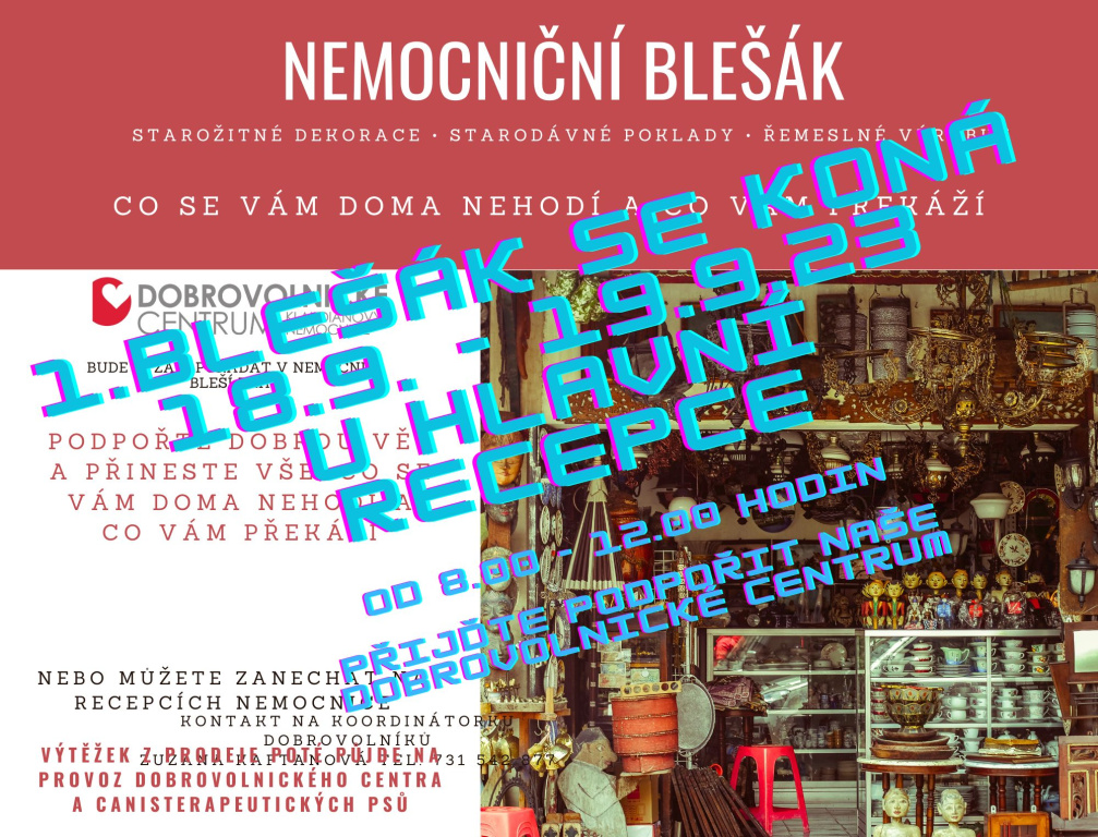 Veřejnost přes léto darovala velké množství zajímavých dekorací a řemeslných výrobků, které nyní pomohou dobré věci. Výtěžek z prodeje podpoří provoz tohoto centra a nemocniční canisterapeutické psy. Bleší trh se koná ve vstupním vestibulu nemocnice (vchod z třídy Václava Klementa) v pondělí 18. a v úterý 19. září od 8 do 12 hodin.