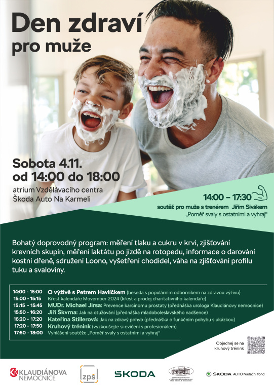 10. října 2023, 11.11 | Mladá Boleslav - Klaudiánova nemocnice společně s firmou Škoda Auto, Nadačním fondem Škoda a Zaměstnaneckou pojišťovnou Škoda pořádá poprvé preventivní akci zaměřenou na mužské zdraví. Den zdraví pro muže se koná v sobotu 4. listopadu od 14 do 18 v prostorách atria Vzdělávacího centra Škoda auto Na Karmeli.