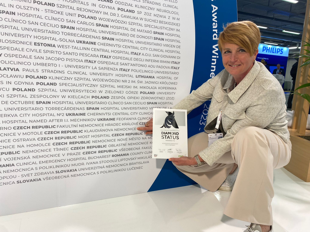 1. června 2024, 10.42 | Mladá Boleslav - Neurologické oddělení Klaudiánovy nemocnice získalo další mezinárodní certifikát od evropské organizace ESO Angels. Ta dlouhodobě monitoruje péči o pacienty s mozkovou příhodou (iktem). Ocenění ESO Angels Awards jsou udělována ve třech stupních. Mladoboleslavské Iktové centrum získalo za rok 2023 nejvyšší diamantové ocenění.