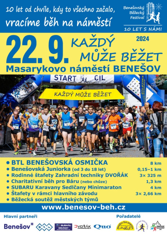 10. srpna 2024, 10.52 | Benešov - Letošní 11. ročník Benešovského Běžeckého Festivalu se vrací zpátky do centra města a opět odstartuje na Masarykově náměstí. Bude to v neděli 22. září a nabídne pestrou paletu závodů. Ani letos nebude chybět charitativní běh, rodinné štafety, závody dětí a mládeže a samozřejmě hlavní závod – Benešovská Osmička, který je zároveň součástí seriálu „Běžec Podblanicka“.