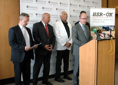 mít priority řešení žhavých témat konkrétnější podobu. S ní seznámili novináře - na snímku zleva ministr životního prostředí Richard Brabec, hejtman ÚK Oldřich Bubeníček, předseda Hospodářské a sociální rady Ústeckého kraje Richard Falbr a premiér Bohuslav Sobotka.