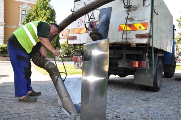 Kromě podzemních odpadkových košů přibude letos i další podzemní kontejnerové stání na tříděný odpad, a to v ulici Žižkova. Půjde o čtvrté kontejnerové stání tohoto typu, přičemž další jsou již nějaký čas v provozu na Dlouhé ulici, v ulici České armády a U Stadionu. Zdroj: Město Litoměřice, foto: Vývoz podzemního odpadkového koše u pokratických závor zajišťují pracovníci Technických služeb města. Nad zemí vyčnívá pouze koš z nerezu, vedle kterého je železný poklop, kterým je odpad vysáván.
