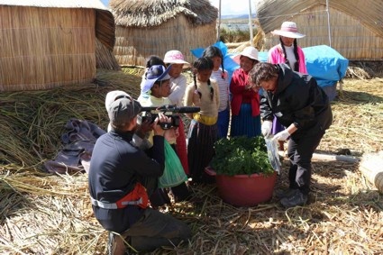 Markéta Marečková při odběru vzorků brambor na plovoucím ostrůvku na jezeře Titicaca
