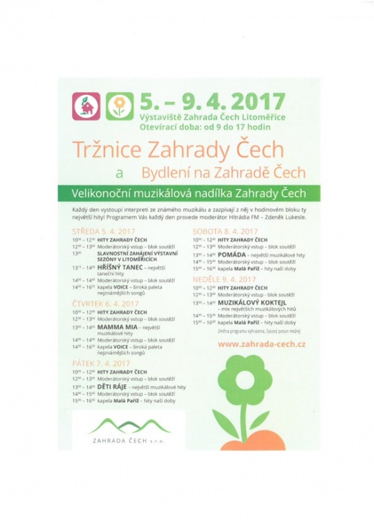 Ve středu 5. dubna v 9 hodin ráno se otevřou brány výstaviště Zahrada Čech a odstartuje tak výstavní sezóna na největším výstavišti na Severu Čech v srdci Ústeckého kraje. Spojené výstavy Tržnice Zahrady Čech a Bydlení na Zahradě Čech nabídnou návštěvníkům oblíbený tradiční sortiment jako je sadba, květiny, cibuloviny, zahradní nářadí, zahradní technika, zahradní nábytek, hnojiva, postřiky, potraviny, přírodní léčiva bude letos obohacen o nábytek, bytové doplňky, vybavení koupelen, kuchyní, dekorační prvky, domácí potřeby a řadu dalšího. Naleznou tu vše, co je spojené se zahradou a vybavením domácnosti. Výstavy proběhnou v pěti dnech od 5. 4. 2016 do 9. 4. 2017 a otevřeno bude denně od 9 - 17 hod.