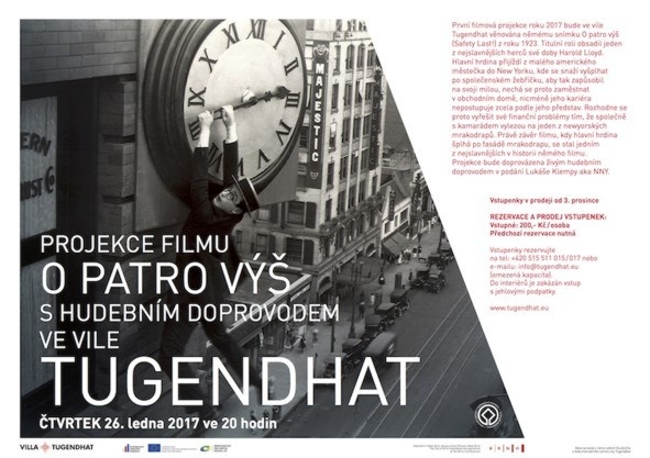 Brno | Cyklus pravidelných filmových projekcí ve vile Tugendhat bude v letošním roce zahájen ve čtvrtek 26. ledna od 20:00 hod. legendou němých snímků O patro výš (Safety Last!). Snímek z roku 1923, v jehož...