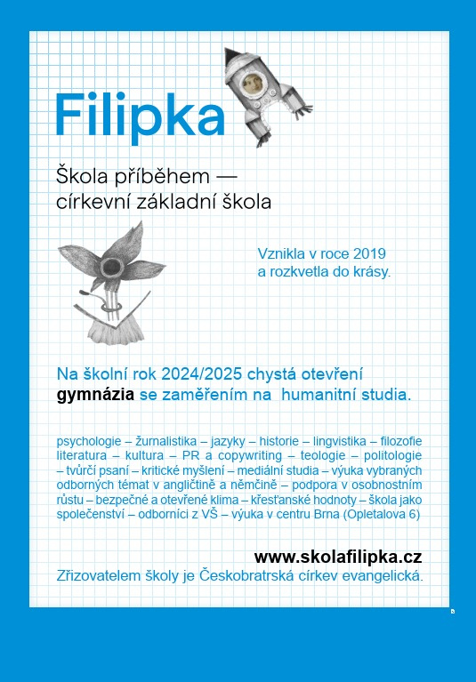 13. prosince 2023, 05.19 | Brno – Gymnázium se zaměřením na humanitní studia vzniká jako další školské zařízení při ZŠ Filipka a jeho zřizovatelem je Českobratrská církev evangelická. Výuka prvního ročníku bude zahájena již v následujícím školním roce (2024/2025).