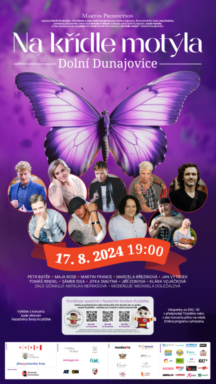 10. srpna 2024, 10.38 | Dolní Dunajovice - Agentura Martin Production, obec Dolní Dunajovice a Via Gabreta Vás zvou na jubilejní 10. ročník benefičního koncertu „Na křídle motýla“.