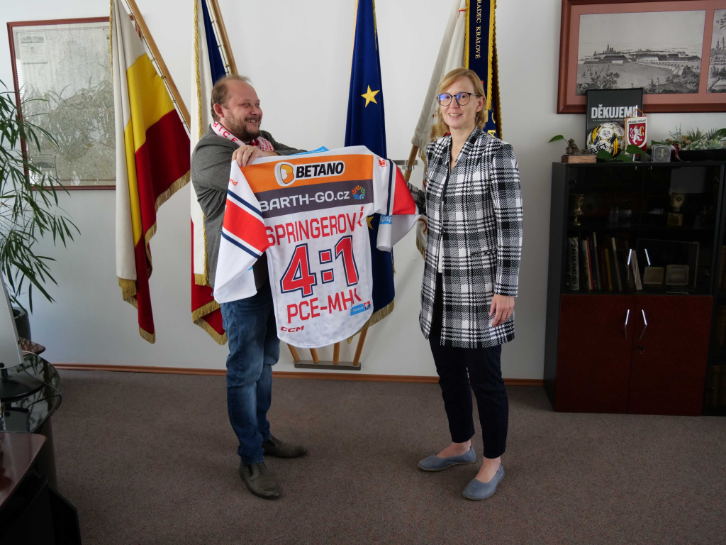 “Víme, že od rozhodujícího duelu už nějaký čas uplynul, ale jsme pověrčiví, a tak jsme dres nechtěli zadávat do výroby dřív než po ukončení série. A samotná výroba speciálního dresu chvíli trvá. Nicméně teď už ho máme, a tak je načase obdarovat paní primátorku Springerovou. Jak už jsem říkal ještě před začátkem čtvrtfinále, věřím, že jí naše barvy budou slušet,” komentoval sázku ještě před samotným předáním dresu pardubický primátor Jan Nadrchal.