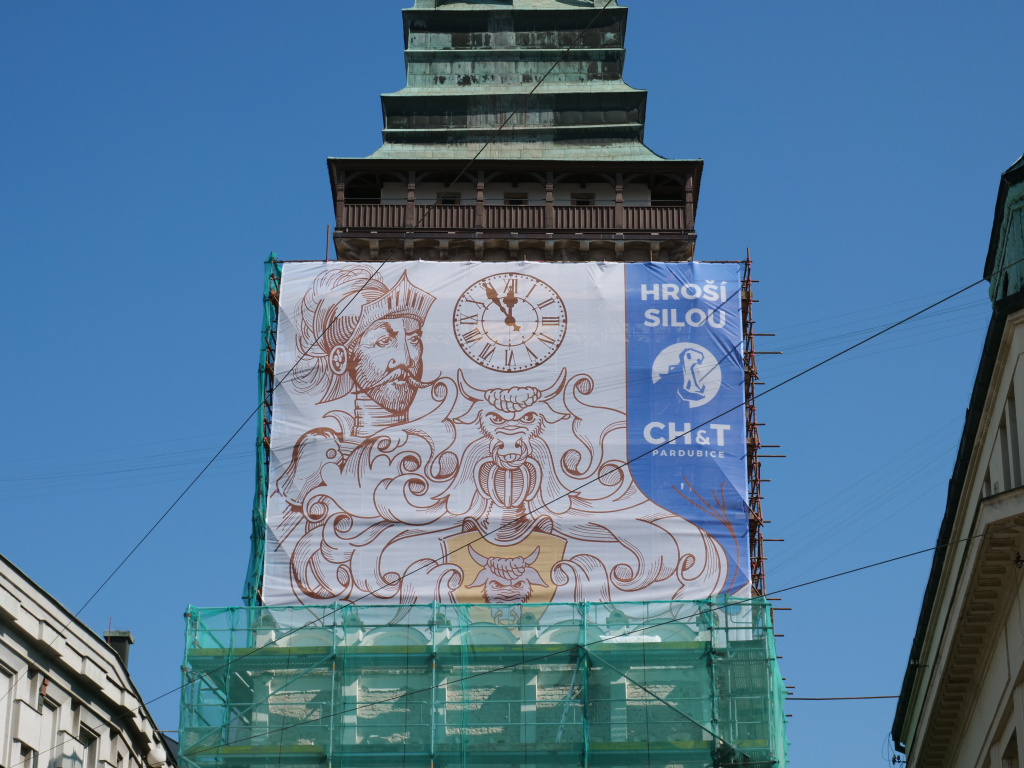 Součástí rekonstrukce je i unikátní zakrytí věže, které tvoří originální ruční perokresba ve stylu Mikoláše Alše, autora návrhu reliéfu na Zelené bráně z roku 1903. Tato koláž, která překrývá lešení, zobrazuje legendu o vzniku městského erbu, erb rodu Pernštejnů a podobiznu Viléma z Pernštejna, významného muže spojeného s rozvojem města. Zadní strana kresby, viditelná z Pernštýnského náměstí, odkazuje na osudový rok 1158 a bitvu u Milána, která měla zásadní význam pro českou historii. Součástí projektu jsou i bannery umístěné na oplocení, které přibližují významné milníky v historii Zelené brány. Okolojdoucí se mohou podívat na dobové fotografie a dozvědět se více o důležitosti tohoto památkového objektu.