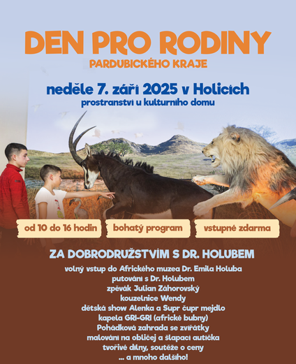 „Den pro rodiny Pardubického kraje je tradiční akce, kterou nám loni znemožnila nepřízeň počasí. Letos se vydáme po stopách Dr. Emila Holuba do Holic. Jsem rád, že se nám podařilo ve spolupráci s městem Holice, zdejším kulturním domem a celou řadou dalších organizací a partnerů nachystat skutečně pestrou nabídku. Pevně věříme, že si z ní vybere úplně každý,“ konstatoval náměstek hejtmana Pardubického kraje pro sociální péči a neziskový sektor Pavel Šotola.