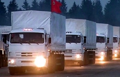 Ruské ministerstvo pro mimořádné situace tvrdí, že do kamionů naložilo na dva tisíce tun potravin, balené vody, léků, zdravotnického materiálu a spacích pytlů.