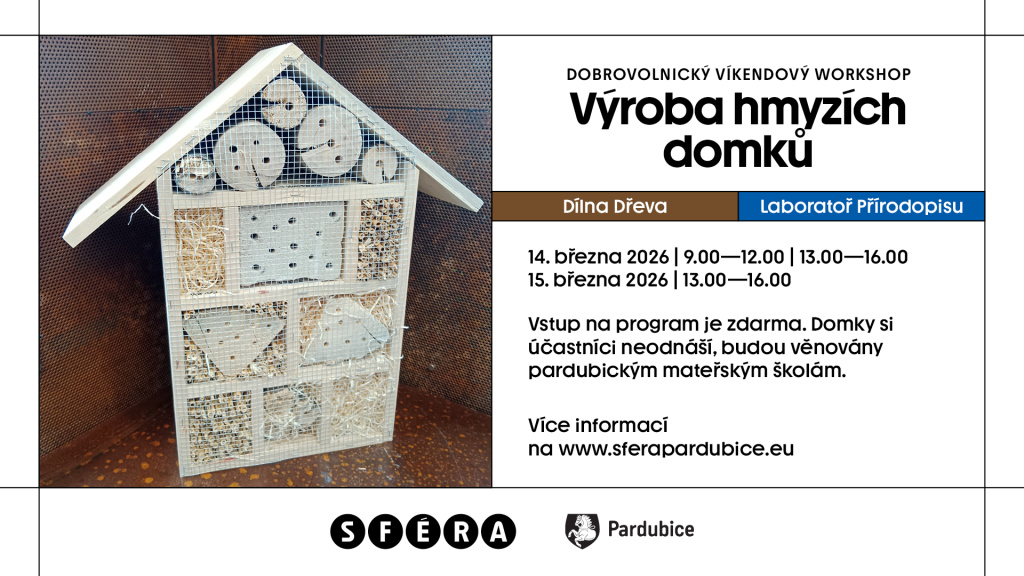 Hmyzí domky vzniknou v rámci dobrovolnického víkendového workshopu, který proběhne 14. a 15. března 2026 ve Vzdělávacím centru SFÉRA. Hotové domky si účastníci neodnesou domů – budou věnovány pardubickým mateřským školám, které o ně projevily zájem. „Celkem se vyrobí 40 domků pro 14 mateřských škol. Všechny mateřské školy v Pardubicích byly na podzim osloveny s nabídkou zapojení a bylo na jejich rozhodnutí, zda se do projektu přihlásí a v jakém rozsahu. Chceme podpořit edukaci těch nejmenších občanů města. Je důležité, aby si vztah k přírodě budovaly už od útlého věku,“ říká náměstkyně primátora pro životní prostředí Jiřina Klčová.