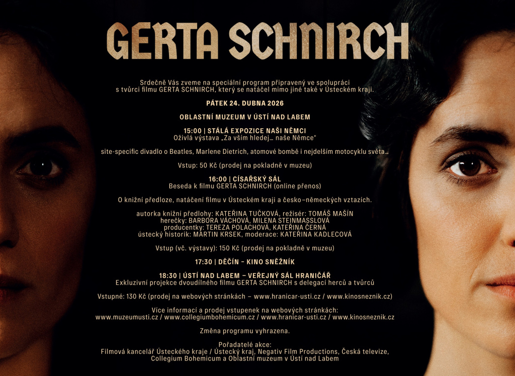 23. dubna 2026, 06.02 | Ústecký kraj - Kraj připravil na pátek 24. dubna mimořádný program věnovaný filmu Gerta Schnirch, který vznikl na motivy románu Vyhnání Gerty Schnirch spisovatelky Kateřiny Tučkové. Návštěvníci se mohou těšit na besedu s tvůrci, živou expozici i večerní projekce filmu v Děčíně a Ústí nad Labem.
