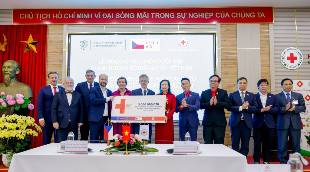 Delegace Senátu navštívila Kancelář Vietnamského Červeného kříže. Předseda Senátu předal viceprezidentce organizace finanční šek ve výši 3 000 000 Kč, který darovalo české ministerstvo zahraničí. Prostředky jsou určeny na humanitární pomoc regionům středního Vietnamu postiženým tropickou bouří Fengshen a tajfunem Matmo v říjnu 2025. Dar bude využit zejména na obnovu školského sektoru v zasažených oblastech. Oficiální cesta horní komory pokračovala programem ve vietnamské metropoli.