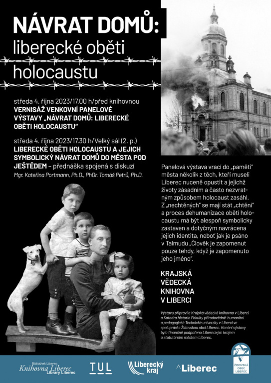1. října 2023, 13.45 | Liberec - Venkovní panelovou výstavu nazvanou Návrat domů: liberecké oběti holocaustu uchystaly u příležitosti 85. výročí událostí spojených s Křišťálovou nocí Krajská vědecká knihovna ve spolupráci s Židovskou obcí Liberec a katedrou historie fakulty přírodovědně-humanitní a pedagogické Technické univerzity v Liberci. Vernisáž se bude konat ve středu 4. října od 17 hodin před budovou knihovny. Na vernisáž naváže přednáška dvou historiků: autorky výstavy Kateřiny Portmann a Tomáše Petrů spojená s diskuzí ve velkém sále od 17:30 hodin.