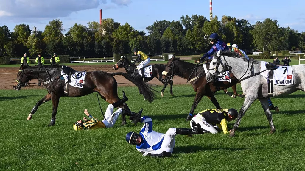 Letošní ročník Velké pardubické se rozhodoval na nejtěžší a nejznámější překážce, Velkém Taxisově příkopu. Skončila na něm téměř polovina startovního pole. Smrtelný byl skok pro devítiletého ryzáka jménem Stuke s francouzským žokejem Benoitem Claudicem v sedle. Těsně před překážkou začal jezdci bočit doleva a způsobil hromadný karambol. Navzdory prvním zprávám, že všichni koně z trati odešli po svých, zveřejnilo později Dostihové závodiště Pardubice (DZP) zprávu, že Stuke se zranil fatálně, měl si srazit vaz.Vážné potíže měl jezdec ryzáka Argana Martin Liška. Po pádu ho podle informací webu iSport.cz museli na místě oživovat, byl převezen do nemocnice. Z vyjádření DZP vyplývá, že by už měl být v pořádku.