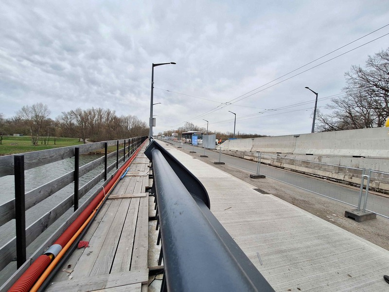 „Stavaři nyní pracují na římse na východní straně mostu, probíhá také montáž inženýrských sítí. Jen pro představu – v chodníku na obou stranách mostu jsou položeny přibližně 2,5 kilometry chrániček. V prvním květnovém týdnu bude probíhat pokládka povrchových živičných vrstev v obou krajních pruzích mostu a přibližně v polovině měsíce května do nich bude převeden provoz. Rekonstrukce je pojatá komplexně tak, aby most dlouhodobě sloužil bez nutnosti dalších výrazných omezení provozu v budoucích desetiletích,“ uvedl náměstek hejtmana pro dopravu Ladislav Valtr. Od konce června by také měly plně sloužit chodníky na obou stranách mostu. Po převedení provozu začnou práce ve středu mostu. „Dojde k demontáži mostních provizorií a nájezdových klínů a začne se pracovat na výměně izolace ve středové části. Dokončí se také přechodové desky a následovat bude pokládka živičných krytů. Na konci července by potom měl most začít sloužit řidičům i chodcům v plném rozsahu,“ doplnil ředitel Správy a údržby silnic Pardubického kraje Zdeněk Vašák.