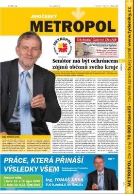 24. září 2010, 23.15 | Senátor má být ochráncem zájmů občanů svého kraje. V letošních senátních volbách obhajuje Tomáš Jirsa post senátora za Českokrumlovsko, Českobudějovicko a Prachaticko.
