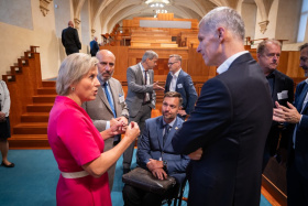 26. listopadu 2025 - Praha - Ve Valdštejnském paláci se včera poprvé sešlo vedení Senátu s novým vedením Poslanecké sněmovny. Předseda horní komory Miloš Vystrčil a předseda dolní komory Tomio Okamura jednali o způsobu komunikace vedení obou komor a jejich kanceláří. Potvrdili si, že budou pokračovat ve způsobu předávání projednávaných tisků a dalších podkladů. Účastníci jednání se shodli také na tom, že je nutné odložit účinnost využití tzv. e-Legislativy.