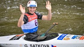 7. srpna 2024 - Most - Po bronzové návštěvě ta zlatá. Na Olympijský festival u jezera Most včera dorazila vítězka smíšené čtyřhry Kateřina Siniaková. A to ve velkém stylu, do areálu totiž připlula na lodi.