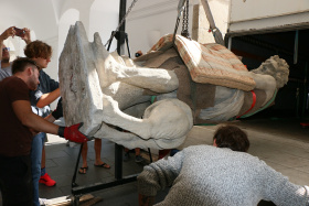 8. srpna 2025 - České Budějovice - Za velké pozornosti novinářů i kolemjdoucích se ve čtvrtek 7. srpna vydala socha Samsona z českobudějovické radnice do Jízdárny Pražského hradu, aby se stala ozdobou výstavy Vltava slavná & splavná.